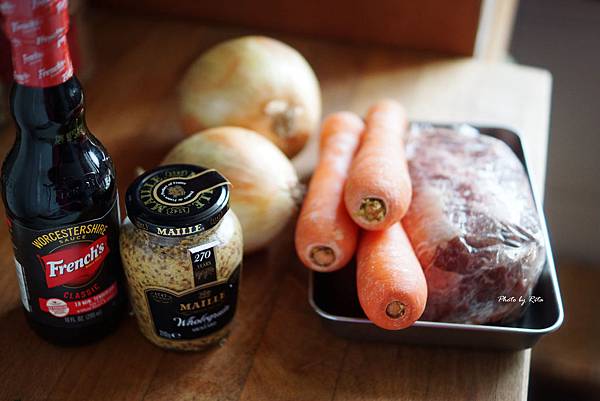 材料:去骨牛腱肉(嫩肩里肌代替)、胡蘿蔔、洋蔥、伍斯特醬、芥末籽醬
